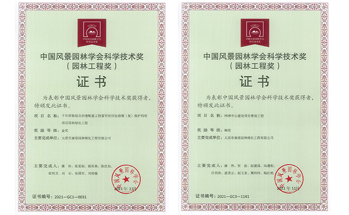 近日,集團(tuán)子公司康培園林收到了中國(guó)風(fēng)景園林學(xué)會(huì)的獲獎(jiǎng)證書(shū),該公司施工的“千年府衙綜合治理配套工程督軍府舊址修繕(復(fù))保護(hù)利用項(xiàng)目園林綠化工程”榮獲2021年中國(guó)風(fēng)景園林學(xué)會(huì)科學(xué)技術(shù)獎(jiǎng)園林工程獎(jiǎng)金獎(jiǎng),填補(bǔ)了山西風(fēng)景園林行業(yè)國(guó)家級(jí)金獎(jiǎng)的空白。同時(shí),該公司“網(wǎng)球中心建設(shè)景觀(guān)工程”施工項(xiàng)目獲得銅獎(jiǎng)。